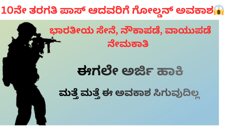 😱 10ನೇ / 12ನೇ ಪಾಸ್ ಯುವಕರಿಗೆ ದೊಡ್ಡ ಅವಕಾಶ! ಭಾರತೀಯ ಸೇನೆ, ನೌಕಾಪಡೆ, ವಾಯುಪಡೆ ನೇಮಕಾತಿ 2026 ಈಗಲೇ ಅರ್ಜಿ ಹಾಕಿ